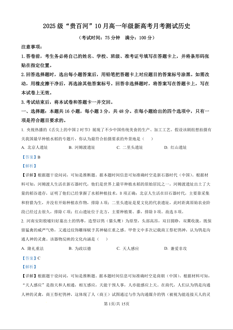 高一历史(精品解析版)--广西贵百河2025-2026学年高一上学期10月考试卷
