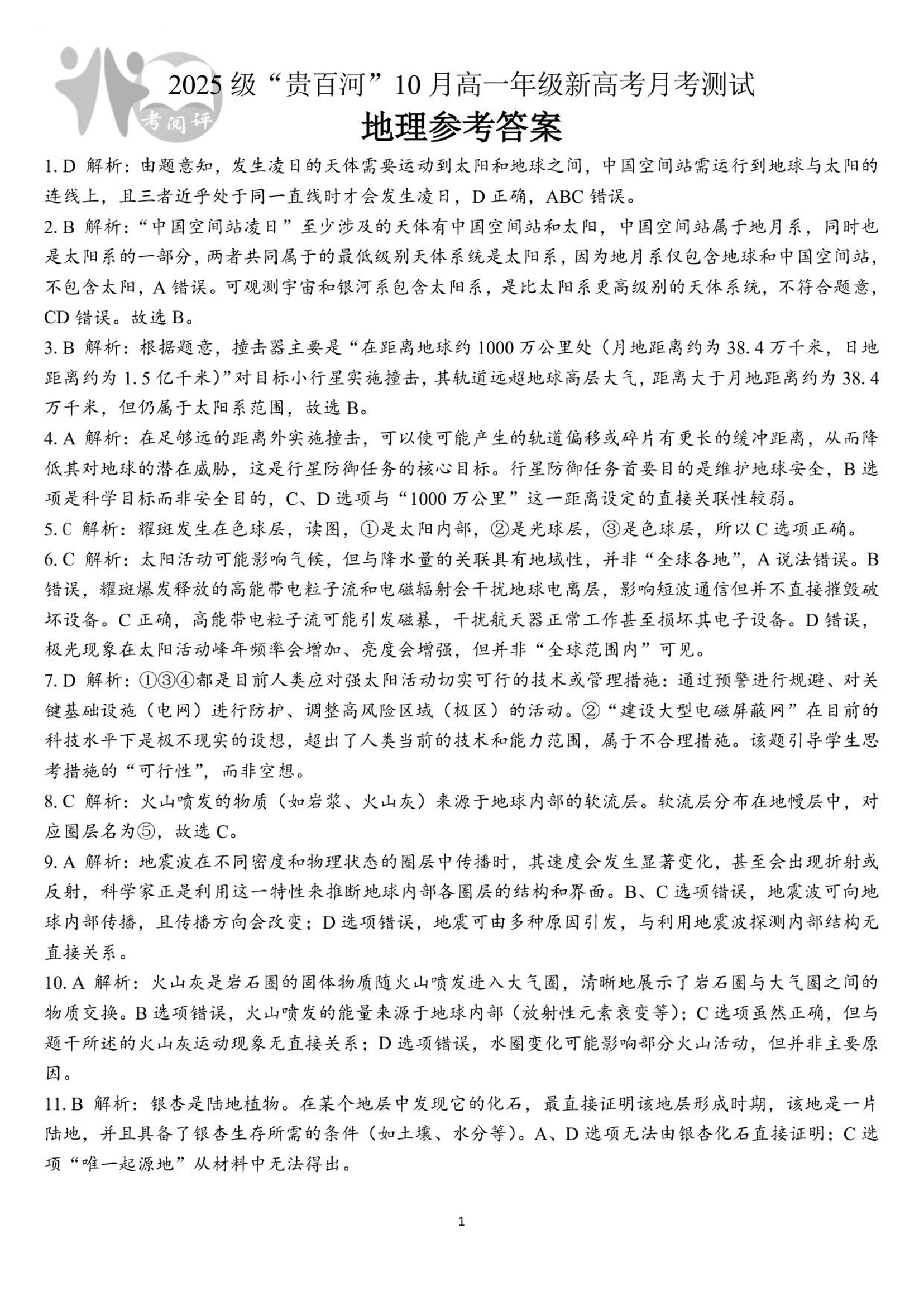 高一地理答案--广西贵百河2025-2026学年高一上学期10月考试卷