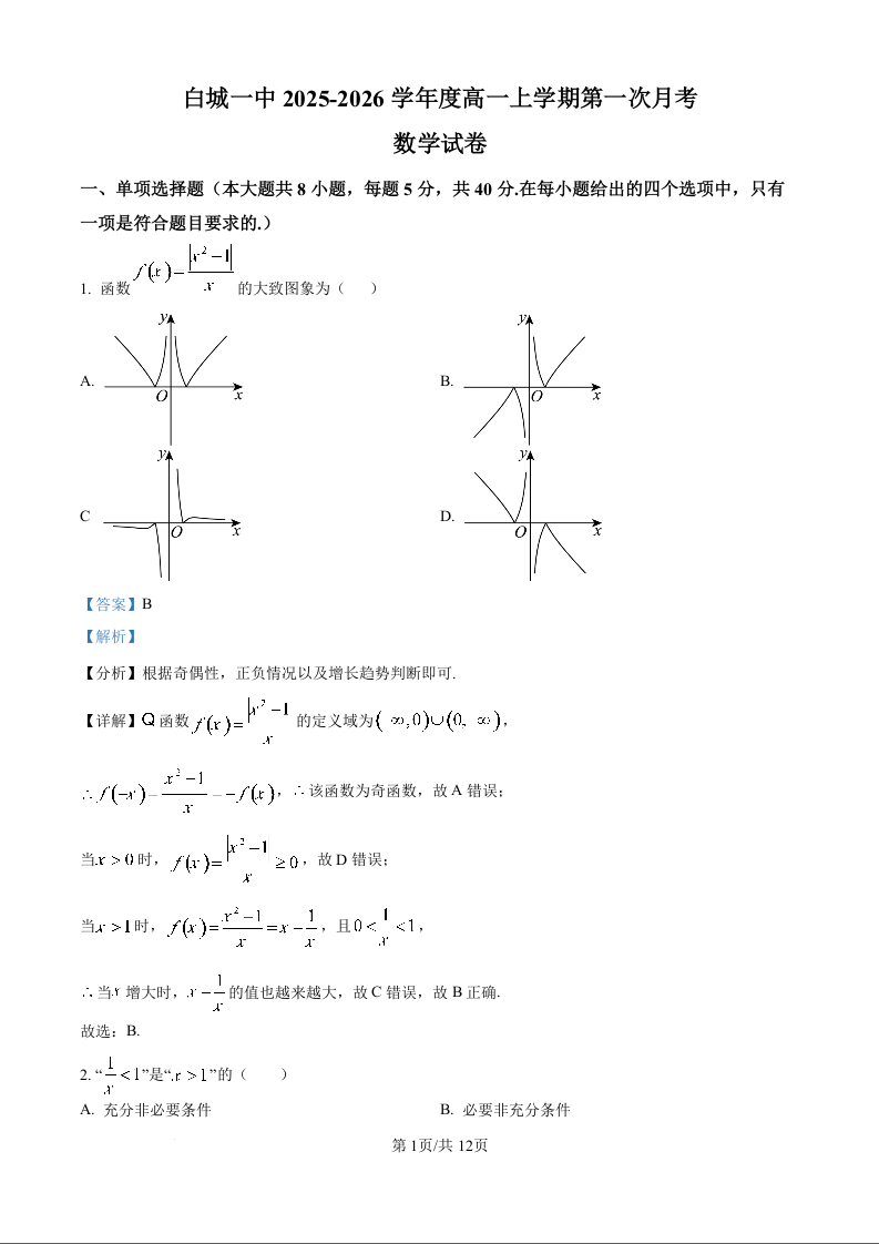 高一数学(精品解析版)--吉林省白城市第一中学2025-2026学年高一上学期第一次月考