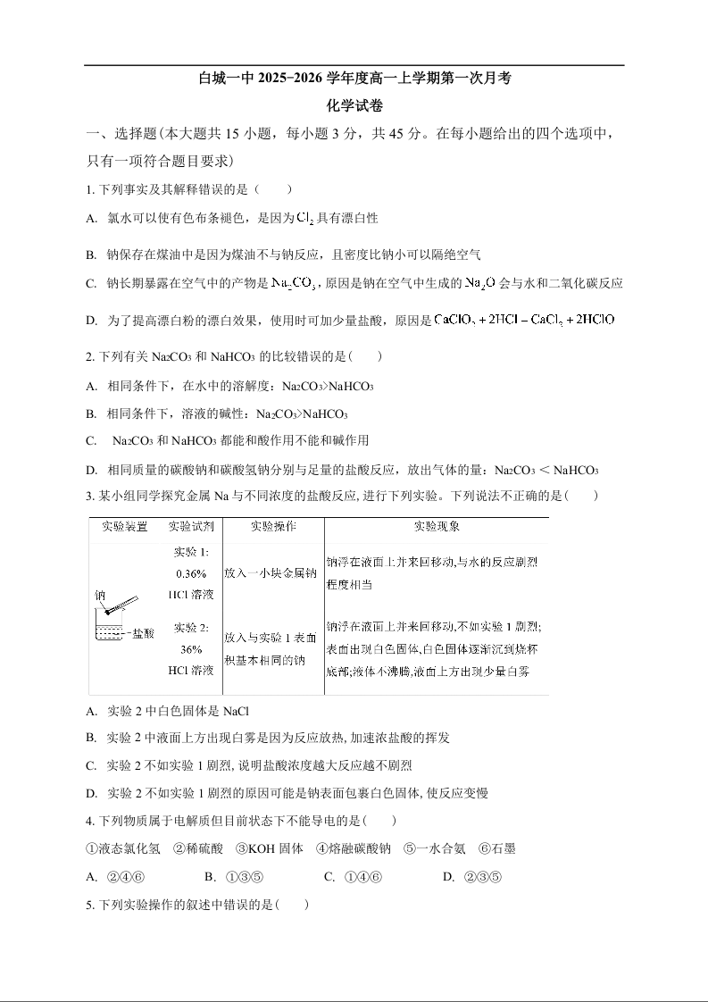 高一化学--吉林省白城市第一中学2025-2026学年高一上学期第一次月考
