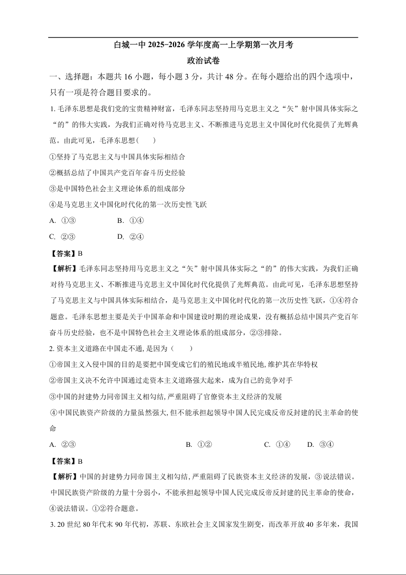 高一政治答案--吉林省白城市第一中学2025-2026学年高一上学期第一次月考
