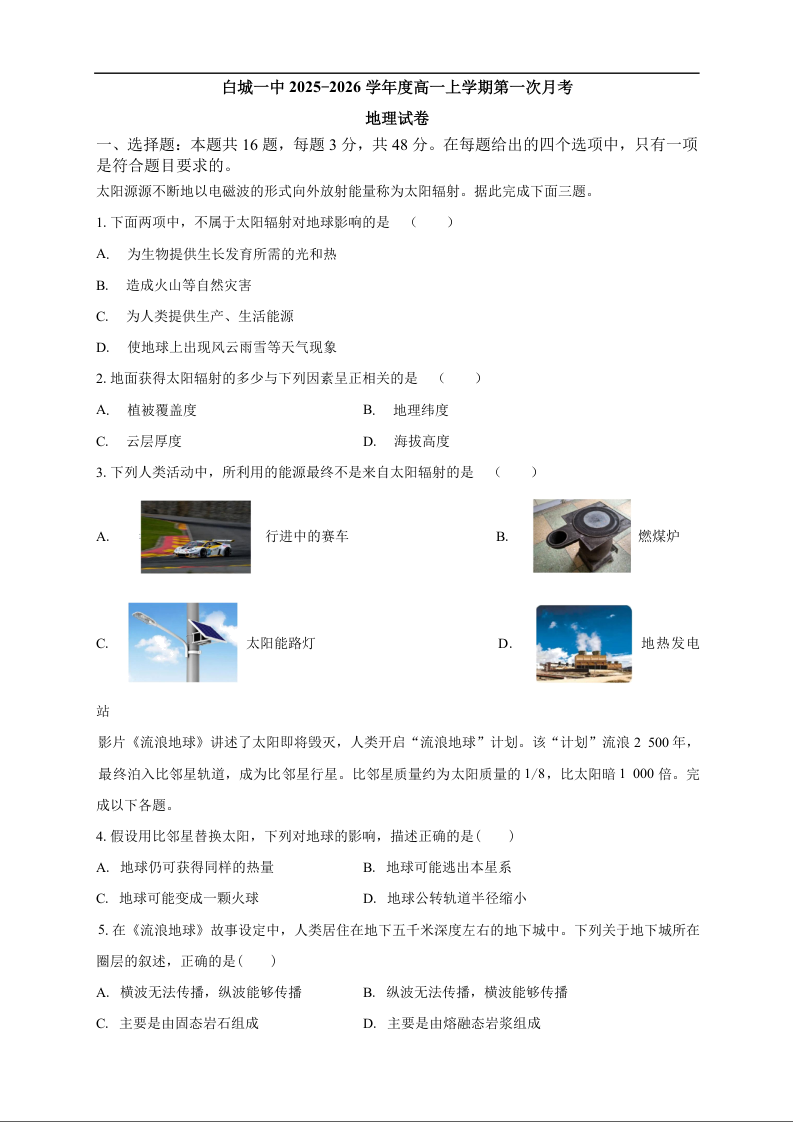 高一地理--吉林省白城市第一中学2025-2026学年高一上学期第一次月考