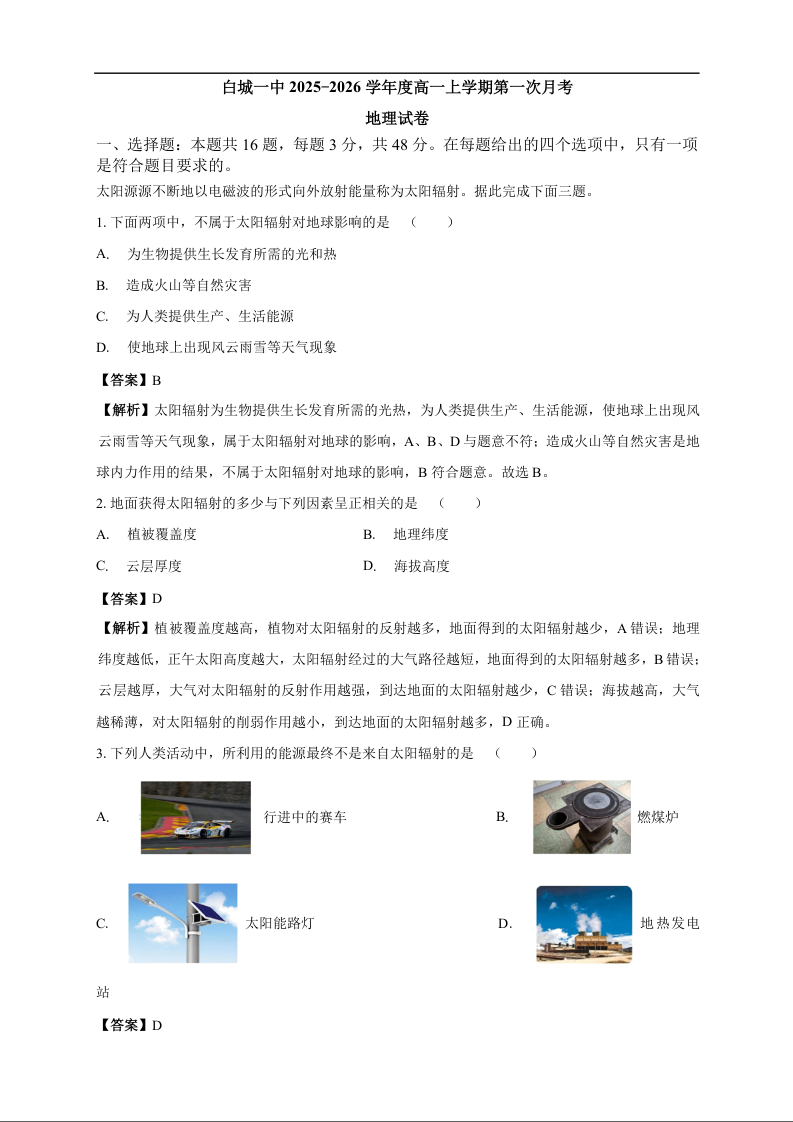 高一地理答案--吉林省白城市第一中学2025-2026学年高一上学期第一次月考