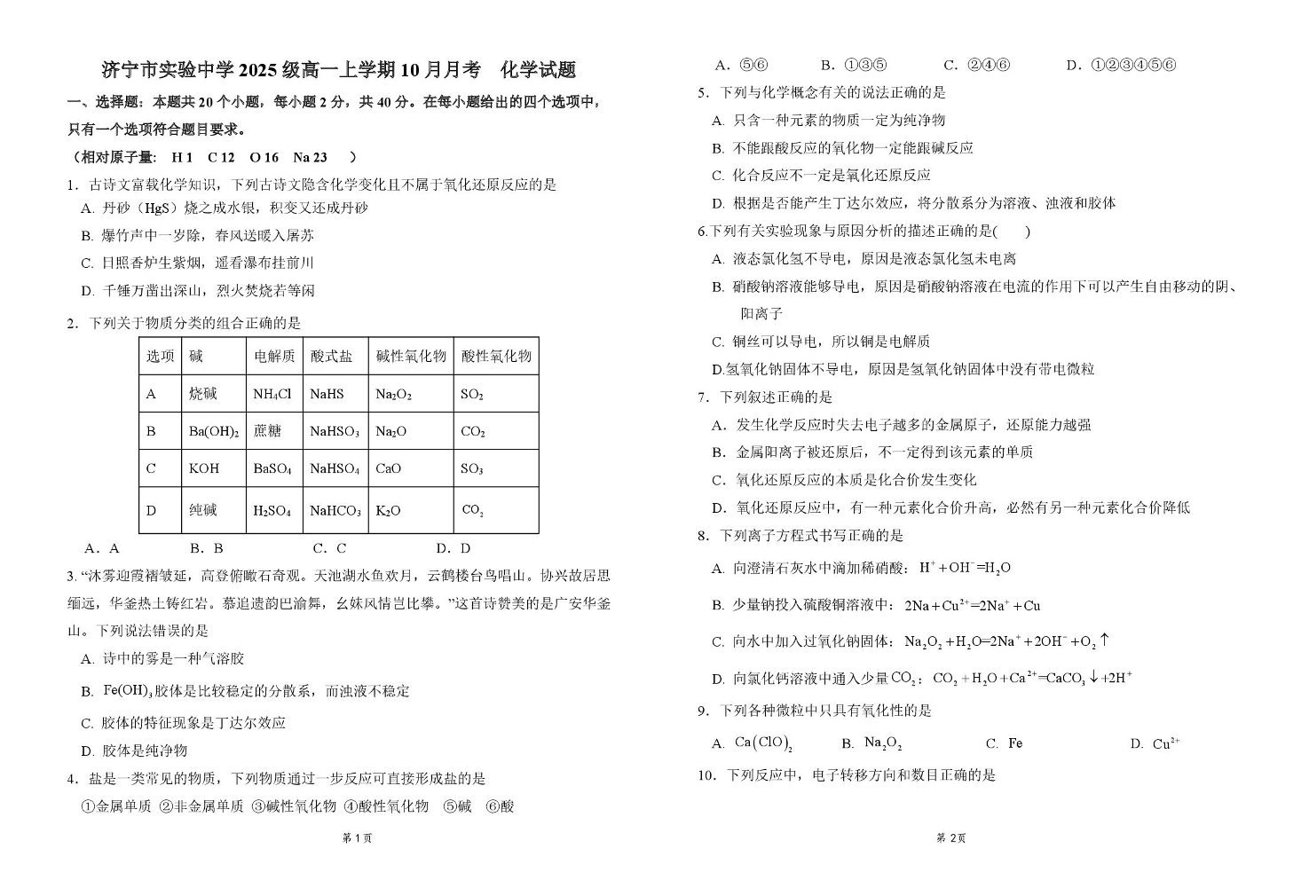高一化学--山东省济宁市实验中学2025-2026学年高一上学期10月月考
