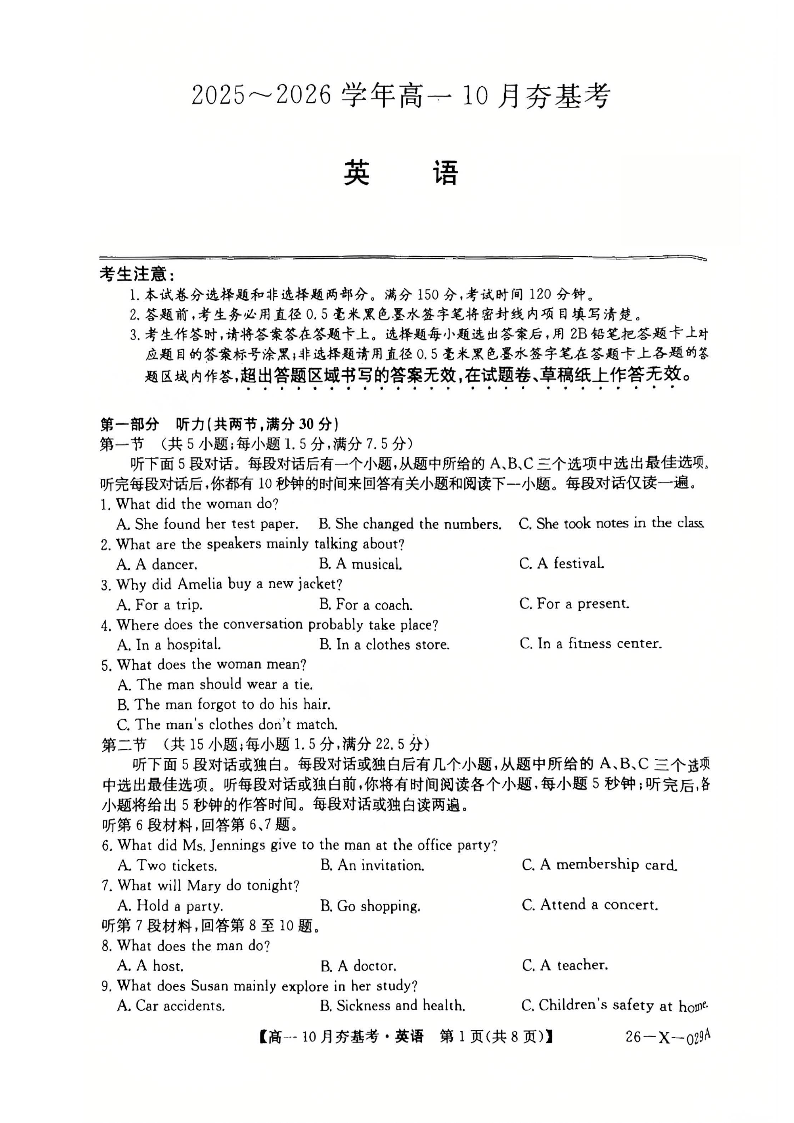 高三英语--山西省三晋卓越联盟2025-2026学年高一10月夯基考