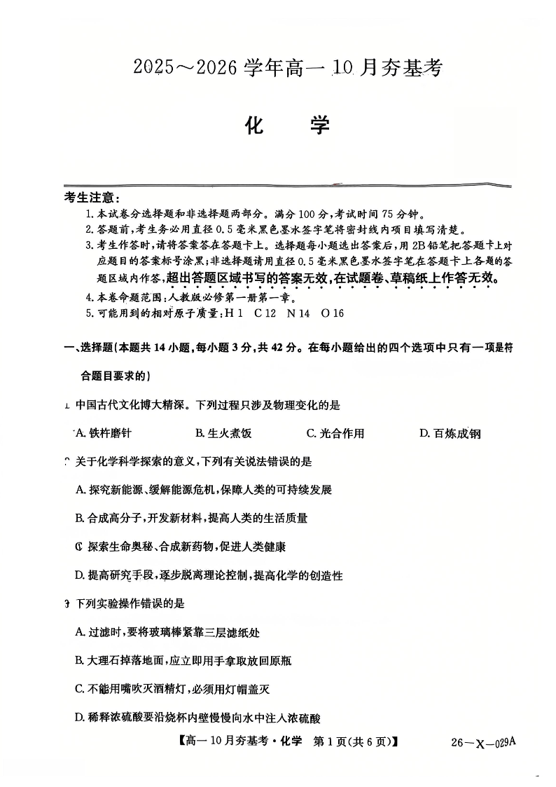 高一化学--山西省三晋卓越联盟2025-2026学年高一10月夯基考