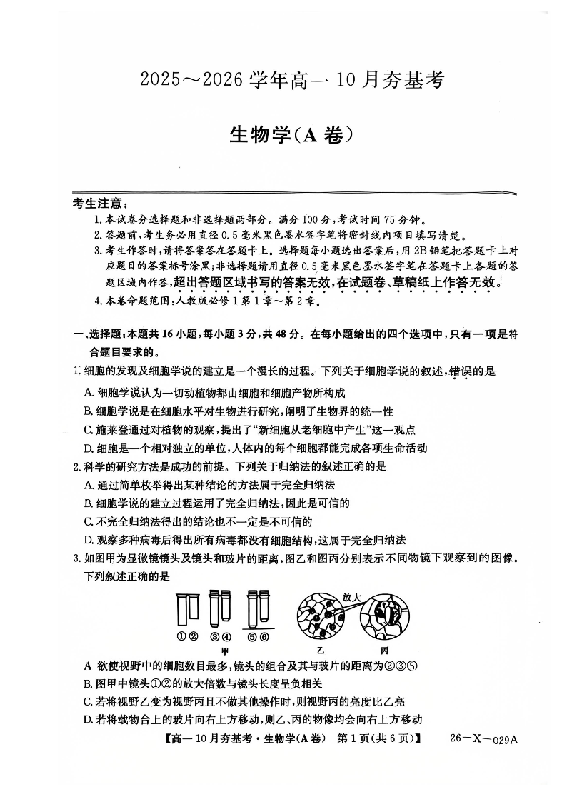 高一生物--山西省三晋卓越联盟2025-2026学年高一10月夯基考