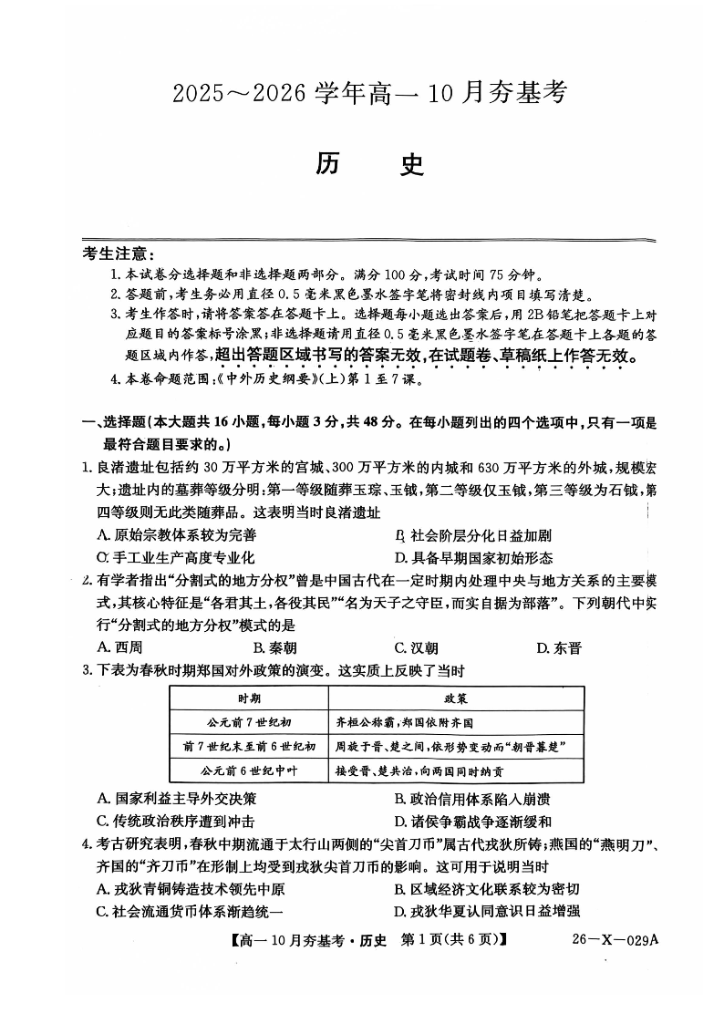 高一历史--山西省三晋卓越联盟2025-2026学年高一10月夯基考