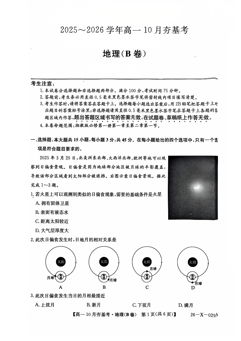 高一地理--山西省三晋卓越联盟2025-2026学年高一10月夯基考