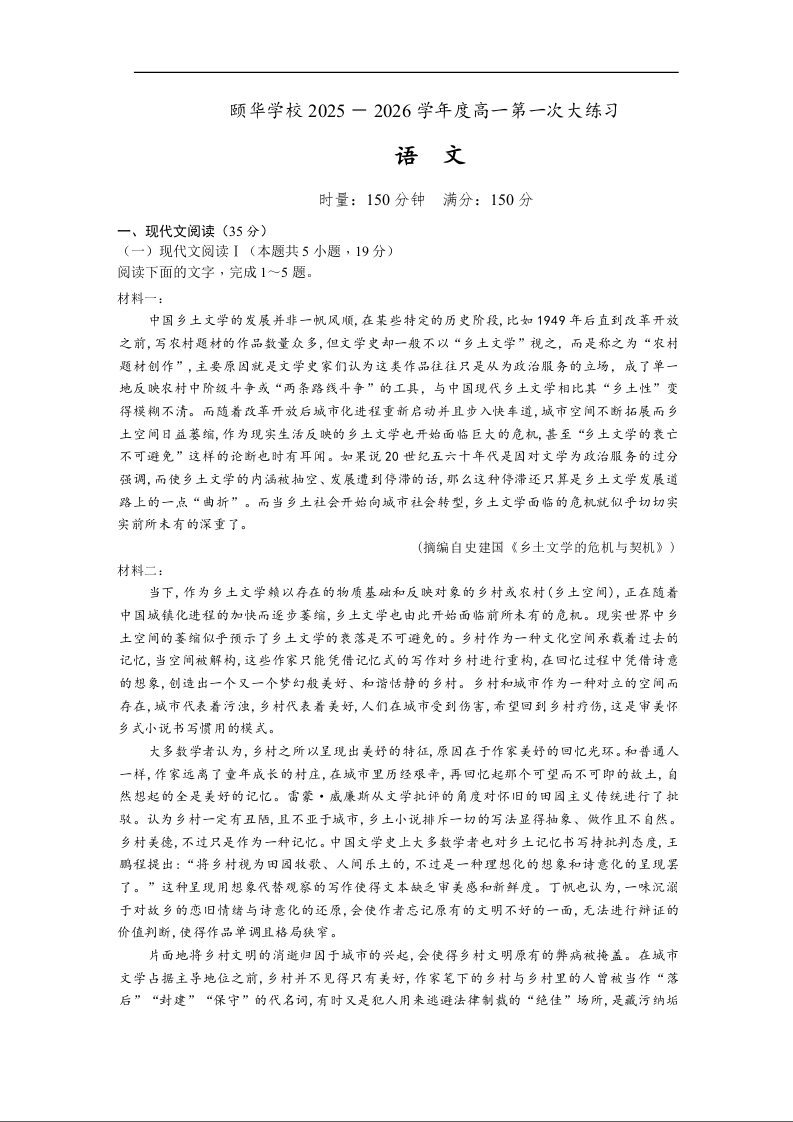 高一语文--湖南省岳阳市颐华高级中学(平江)2025-2026学年高一上学期第一次月考