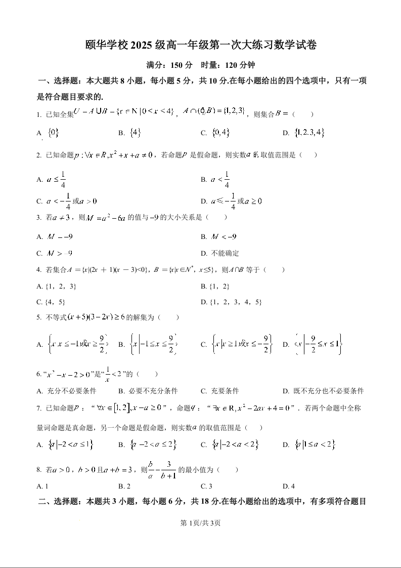 高一数学(原卷版)--湖南省岳阳市颐华高级中学(平江)2025-2026学年高一上学期第一次月考