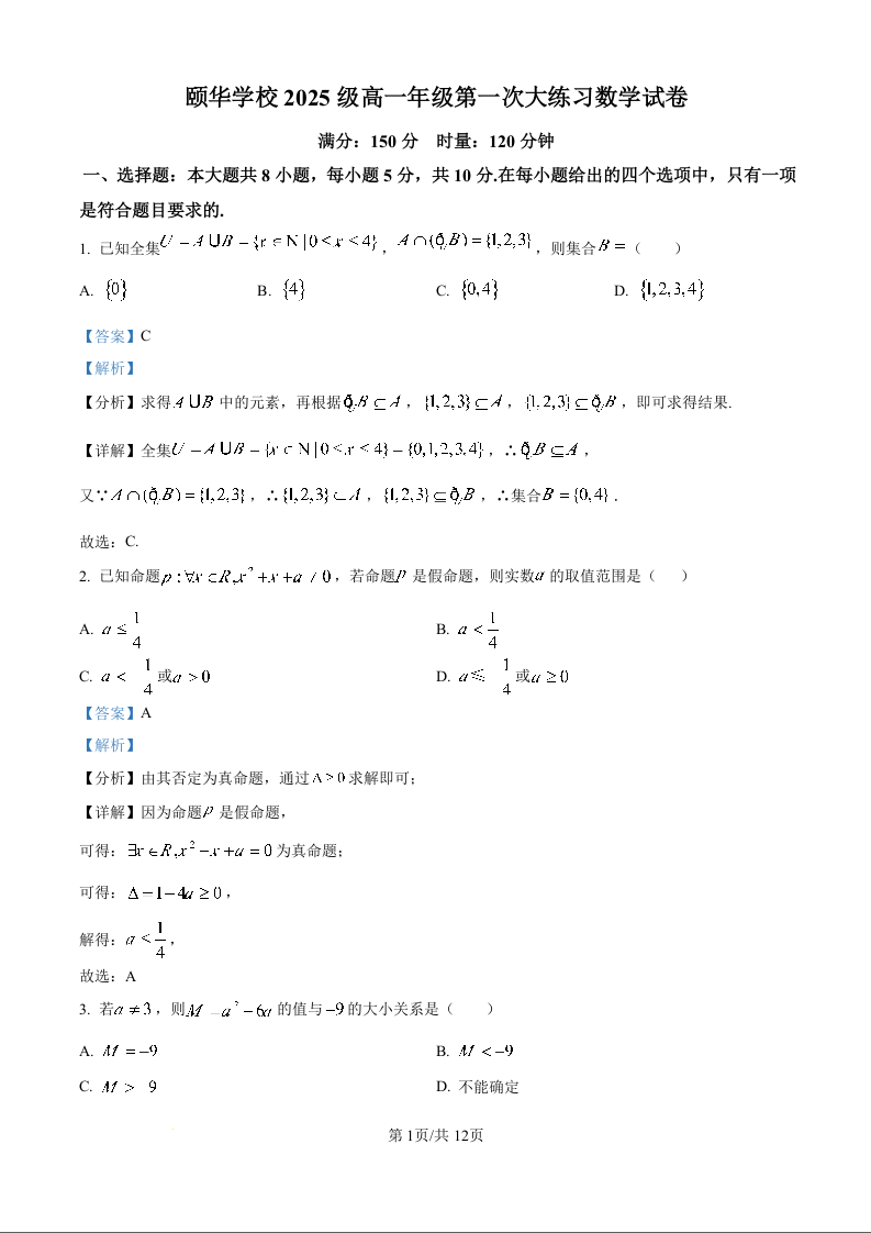 高一数学(精品解析版)--湖南省岳阳市颐华高级中学(平江)2025-2026学年高一上学期第一次月考