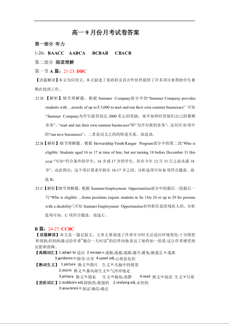 高一英语答案--湖南省岳阳市颐华高级中学(平江)2025-2026学年高一上学期第一次月考
