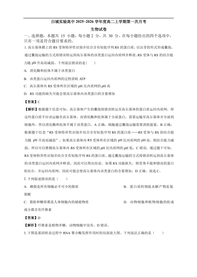 高二生物答案--吉林省白城市实验高级中学2025-2026学年高二上学期10月月考