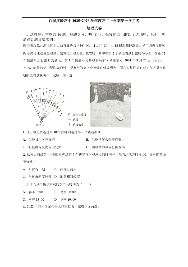 高二地理--吉林省白城市实验高级中学2025-2026学年高二上学期10月月考