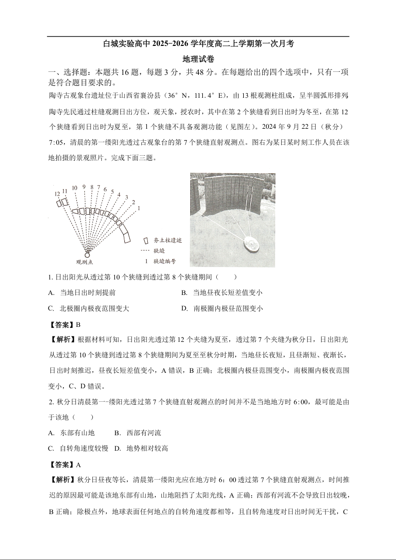 高二地理答案--吉林省白城市实验高级中学2025-2026学年高二上学期10月月考