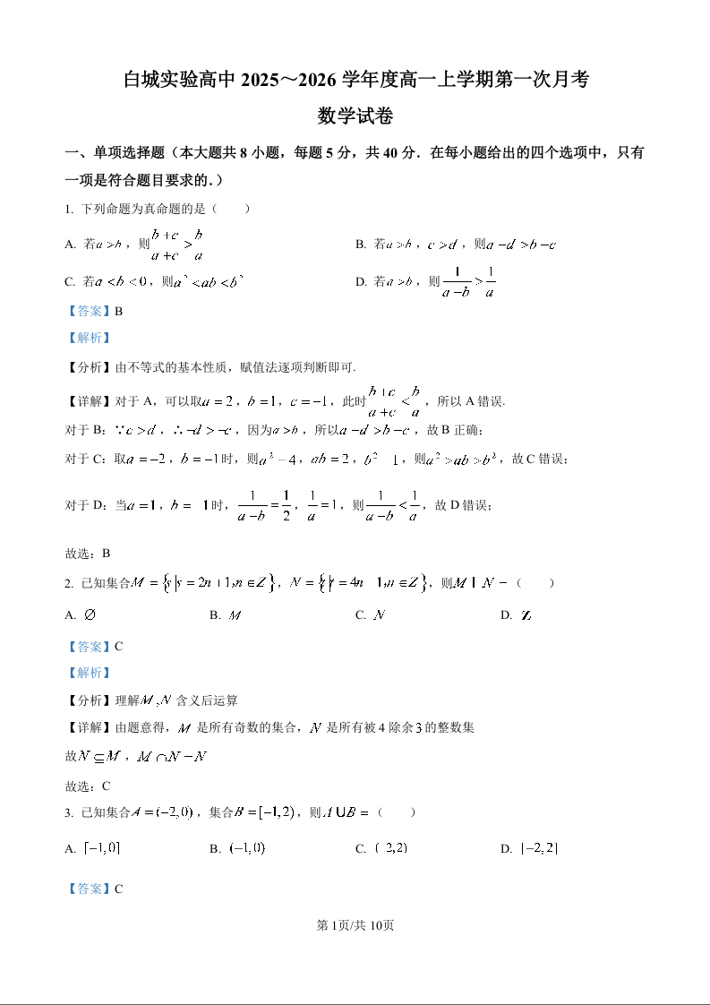 高一数学(精品解析版)--吉林省白城市实验高级中学2025-2026学年高一上学期10月月考