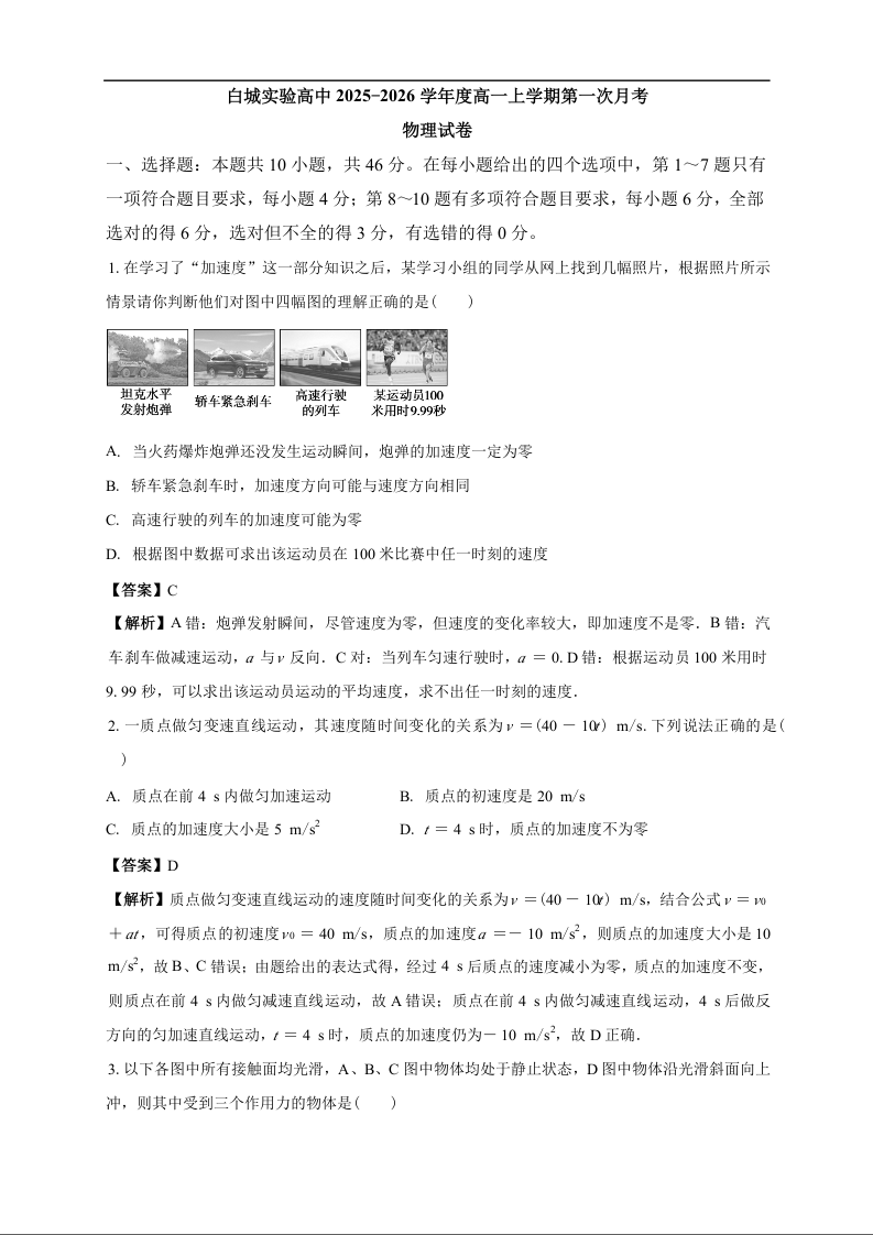 高一物理答案--吉林省白城市实验高级中学2025-2026学年高一上学期10月月考