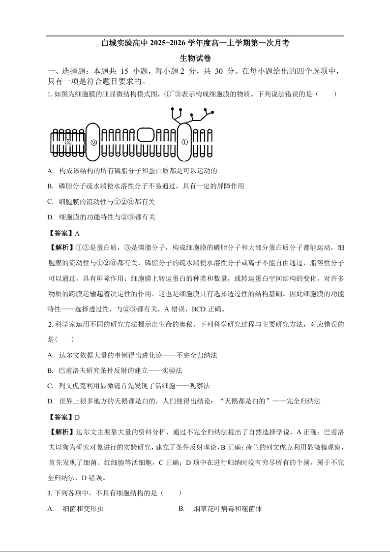 高一生物答案--吉林省白城市实验高级中学2025-2026学年高一上学期10月月考
