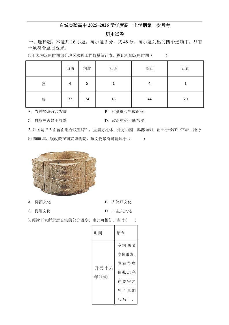 高一历史--吉林省白城市实验高级中学2025-2026学年高一上学期10月月考