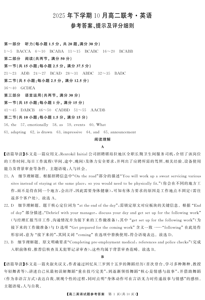 高二英语答案--湖南天壹名校联盟2025年下学期10月高二联考