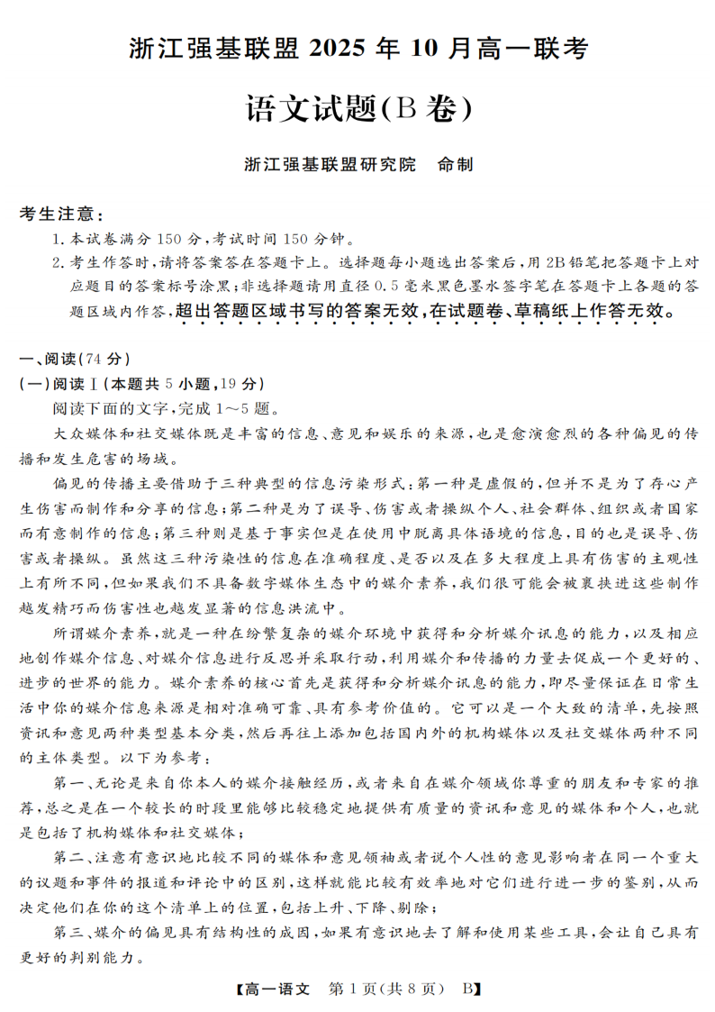 高一语文--浙江省强基联盟2025-2026学年高一上学期10月联考B卷