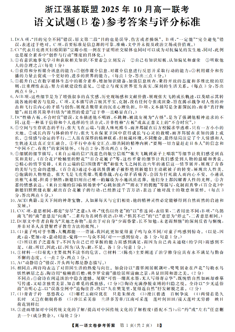 高一语文答案--浙江省强基联盟2025-2026学年高一上学期10月联考B卷