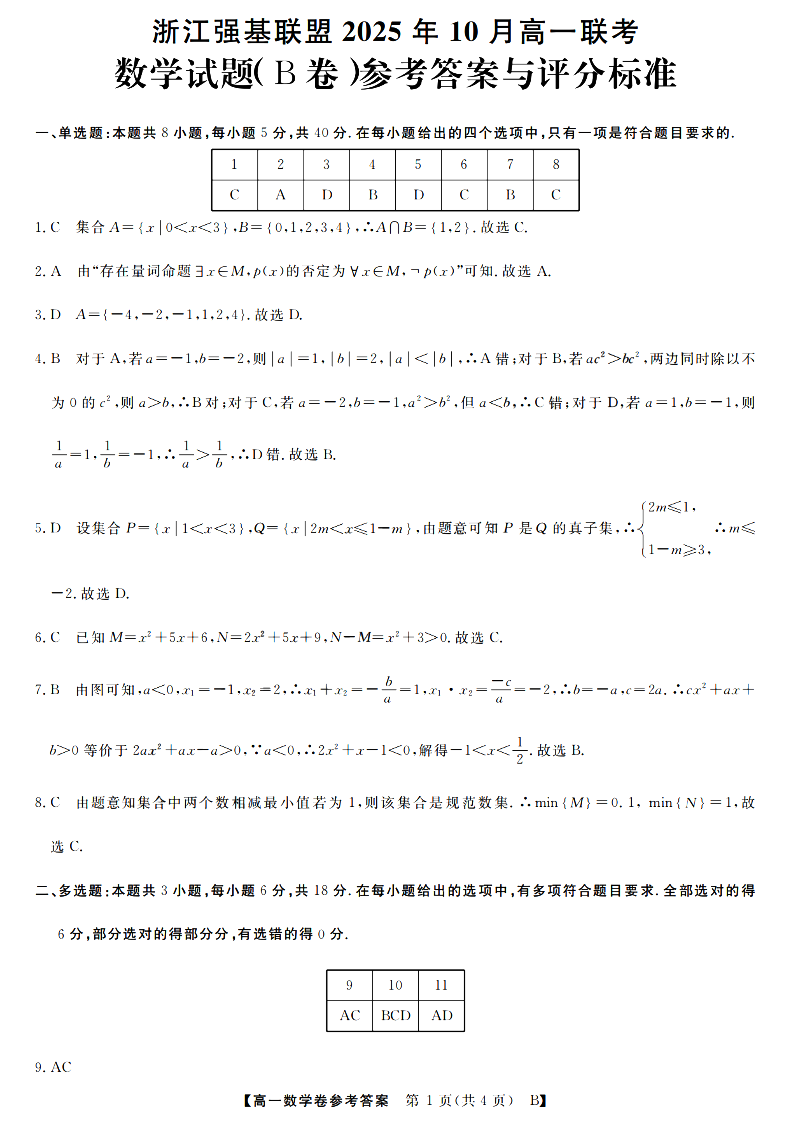 高一数学答案--浙江省强基联盟2025-2026学年高一上学期10月联考B卷