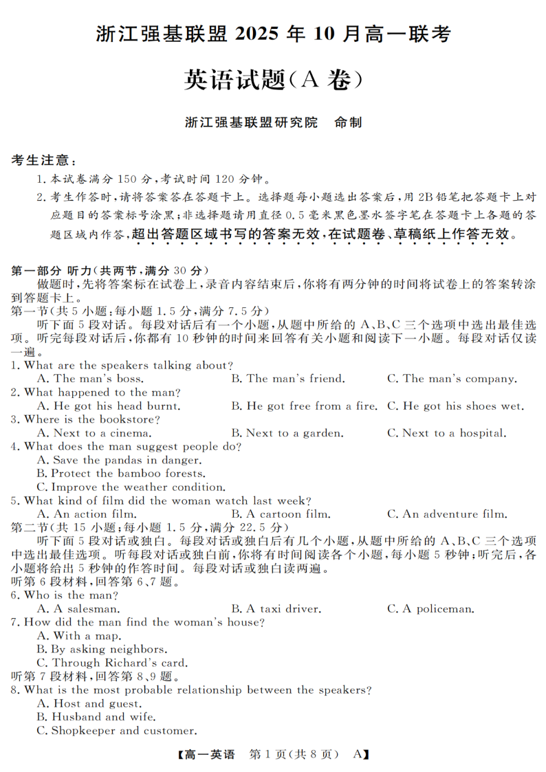 高一英语--浙江省强基联盟2025-2026学年高一上学期10月联考A卷
