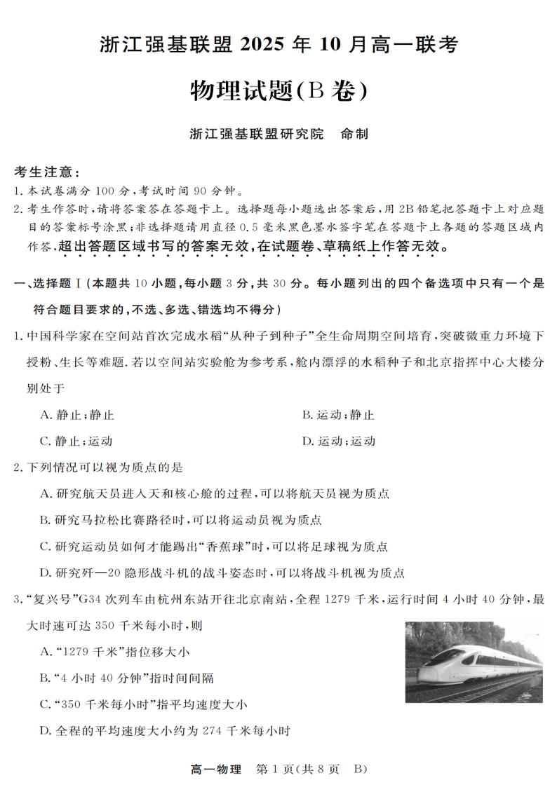 高一物理--浙江省强基联盟2025-2026学年高一上学期10月联考B卷