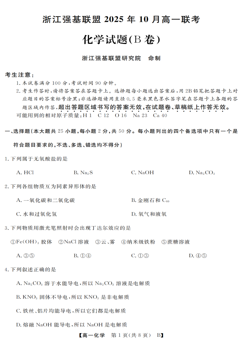 高一化学--浙江省强基联盟2025-2026学年高一上学期10月联考B卷