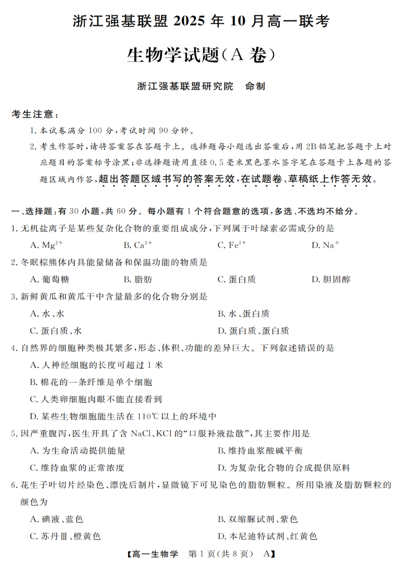 高一生物--浙江省强基联盟2025-2026学年高一上学期10月联考A卷