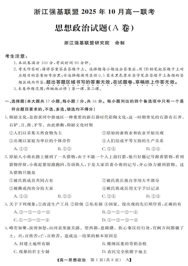 高一政治--浙江省强基联盟2025-2026学年高一上学期10月联考A卷