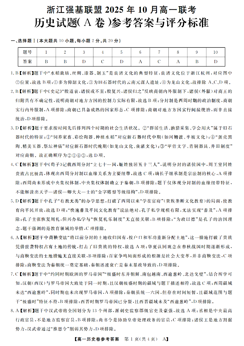 高一历史答案--浙江省强基联盟2025-2026学年高一上学期10月联考A卷