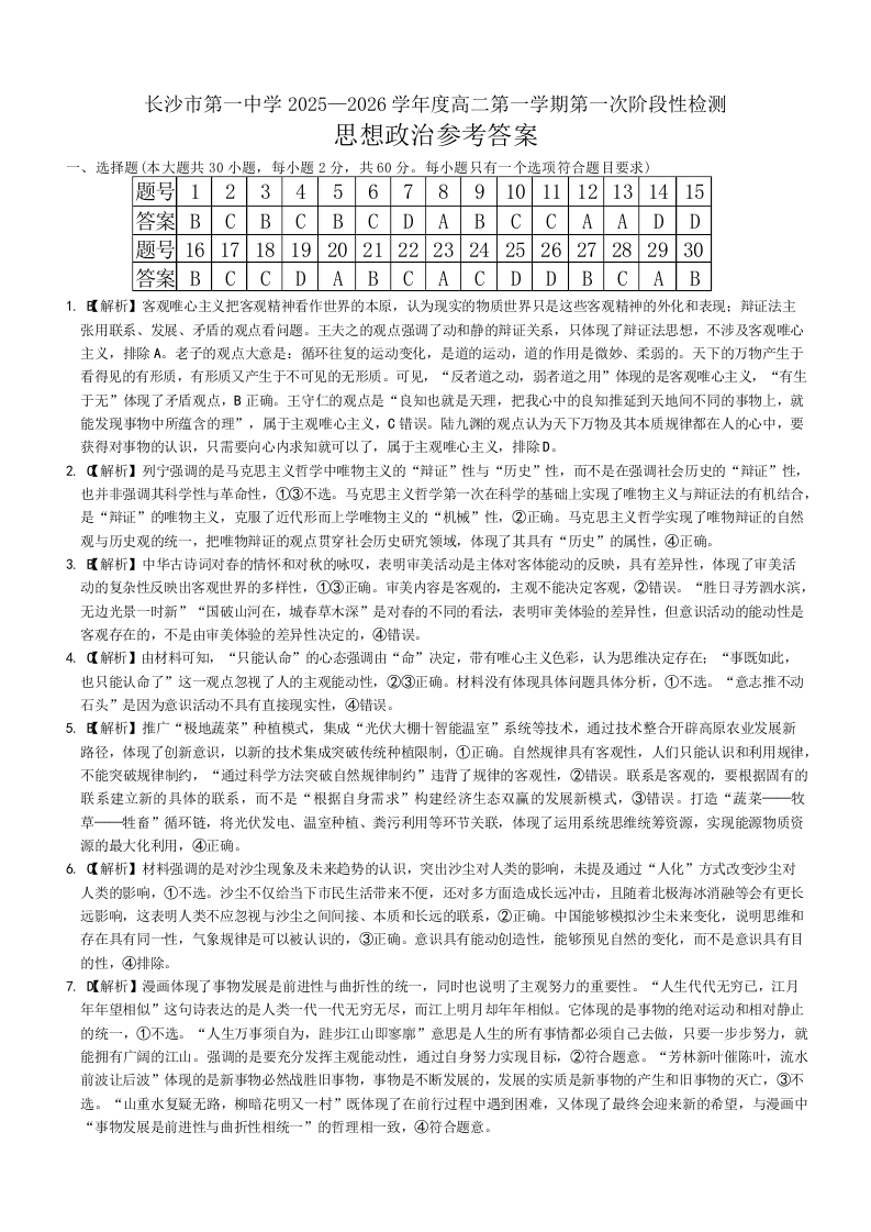 高二政治答案--湖南省长沙市第一中学2025-2026学年高二上学期10月月考