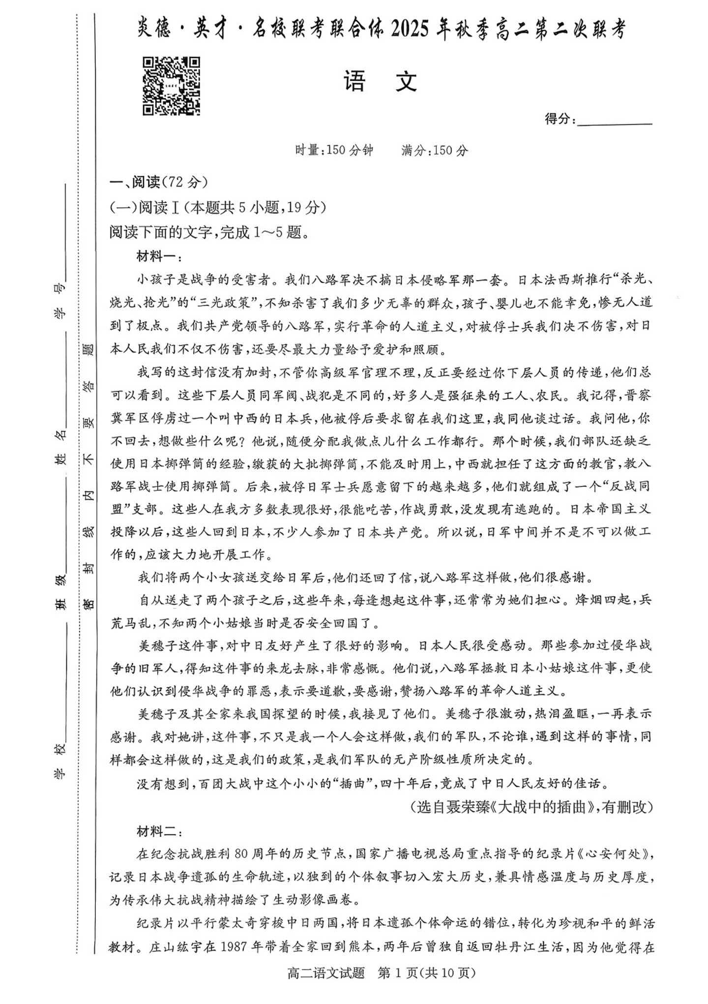 高二语文--湖南省炎德英才名校联考联合体2025年秋季高二第二次联考
