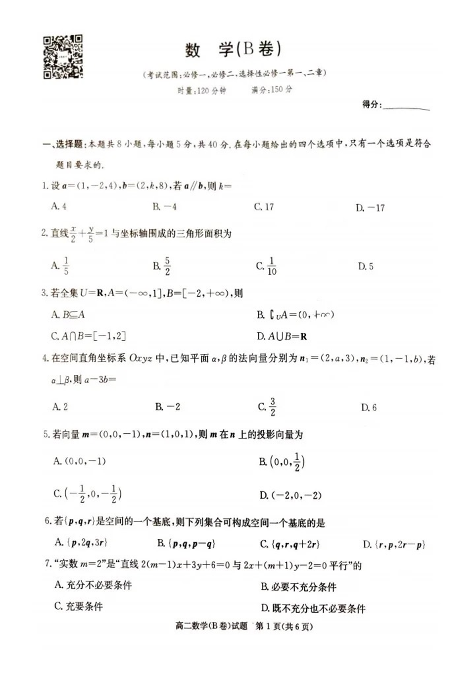 高二数学B--湖南省炎德英才名校联考联合体2025年秋季高二第二次联考