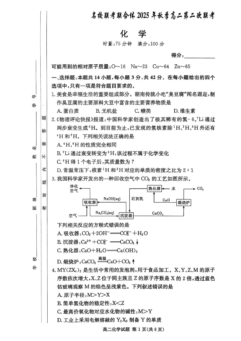 高二化学--湖南省炎德英才名校联考联合体2025年秋季高二第二次联考