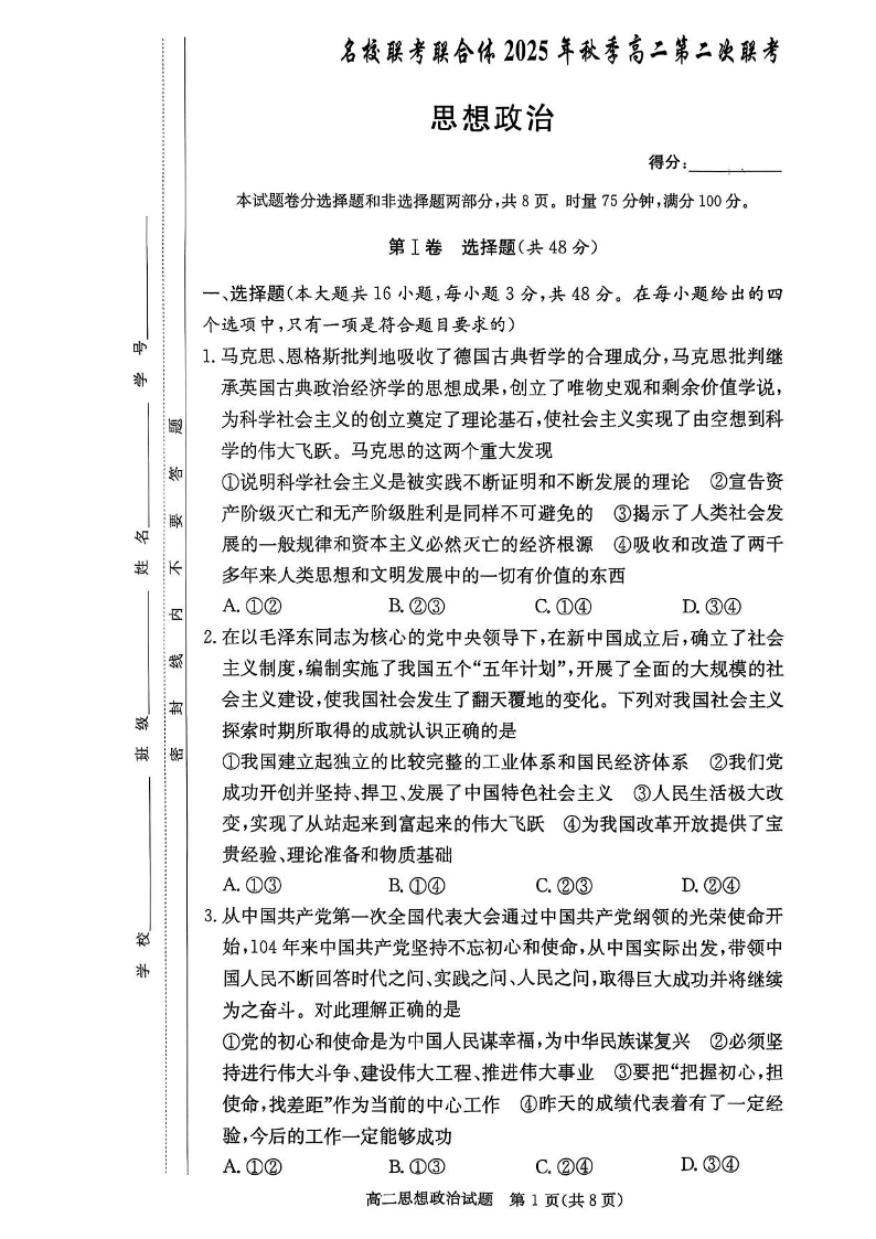 高二政治--湖南省炎德英才名校联考联合体2025年秋季高二第二次联考