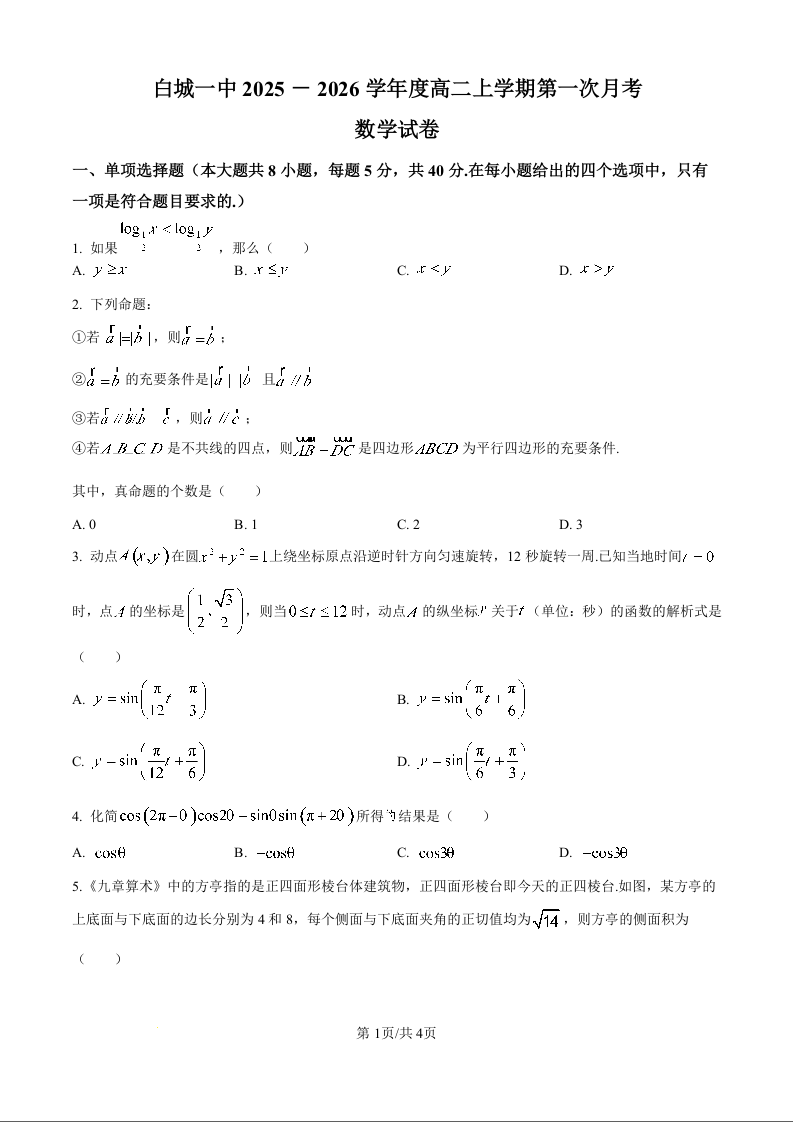 高二数学(原卷版)--吉林省白城市第一中学2025-2026学年高二上学期第一次月考