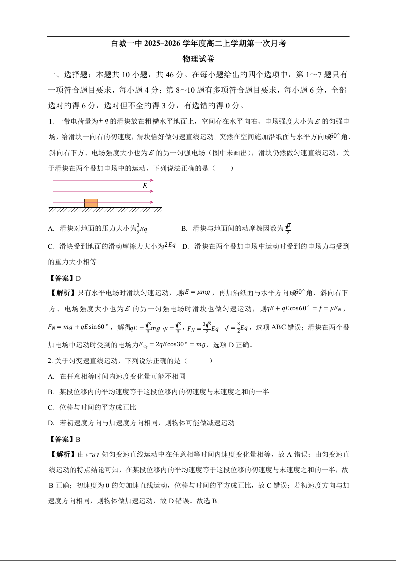 高二物理答案--吉林省白城市第一中学2025-2026学年高二上学期第一次月考