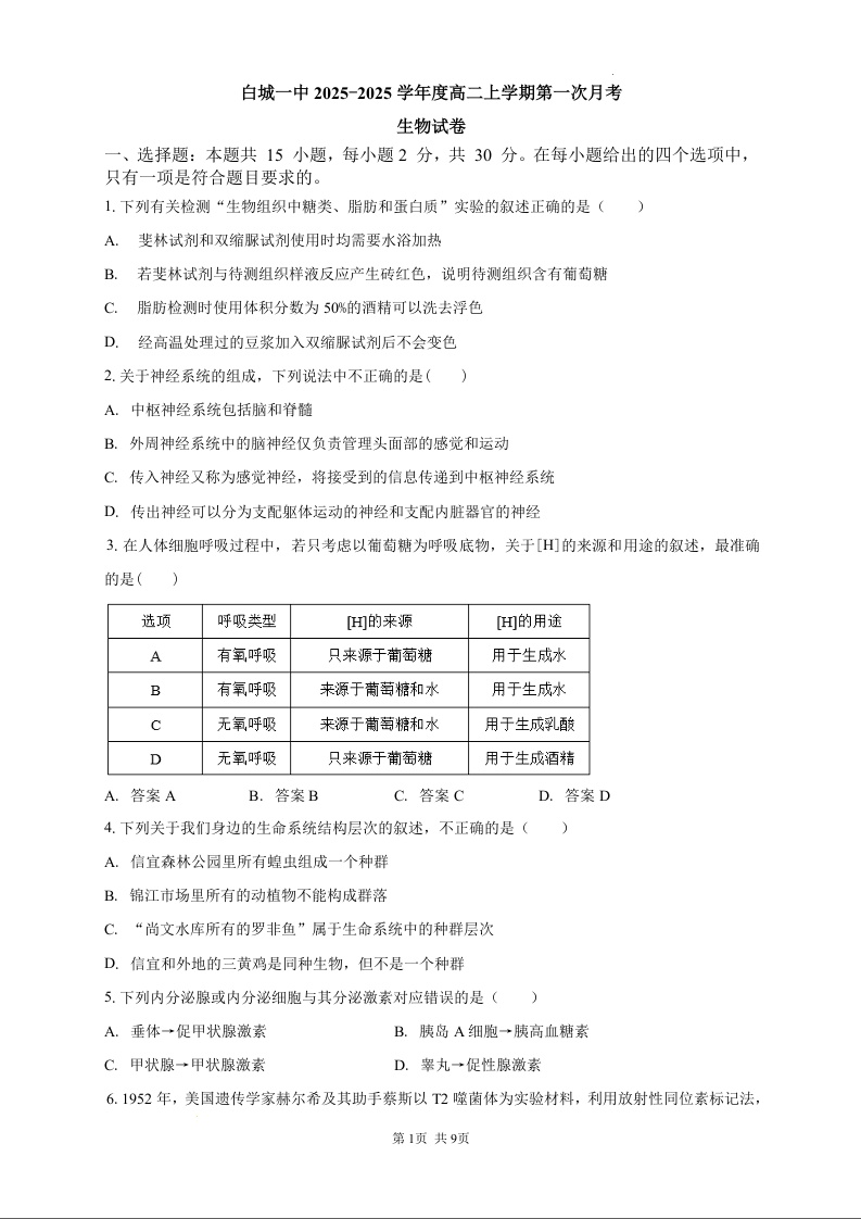 高二生物--吉林省白城市第一中学2025-2026学年高二上学期第一次月考