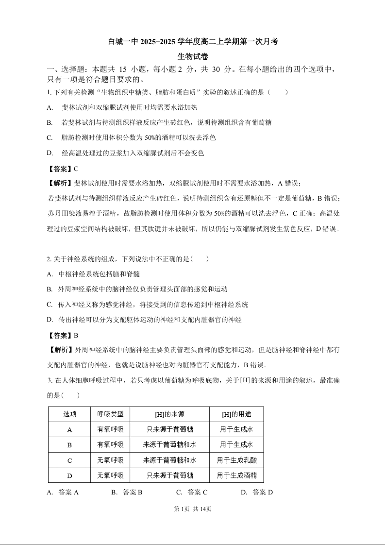 高二生物答案--吉林省白城市第一中学2025-2026学年高二上学期第一次月考