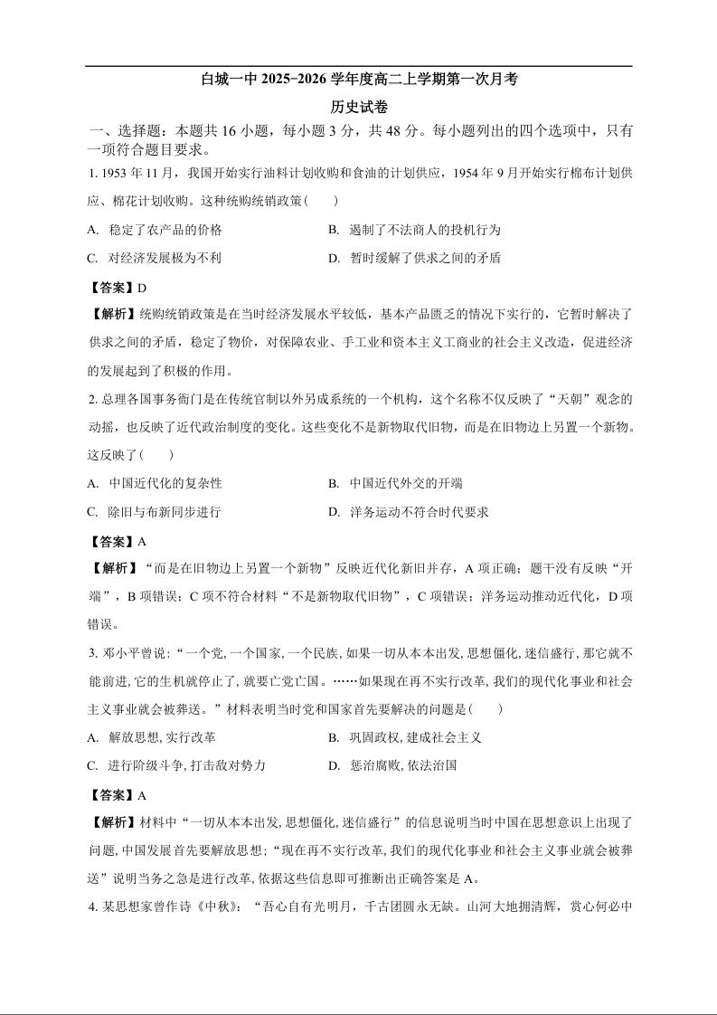 高二历史答案--吉林省白城市第一中学2025-2026学年高二上学期第一次月考