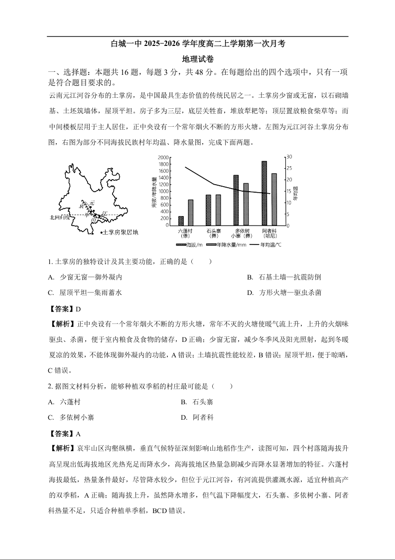 高二地理答案--吉林省白城市第一中学2025-2026学年高二上学期第一次月考