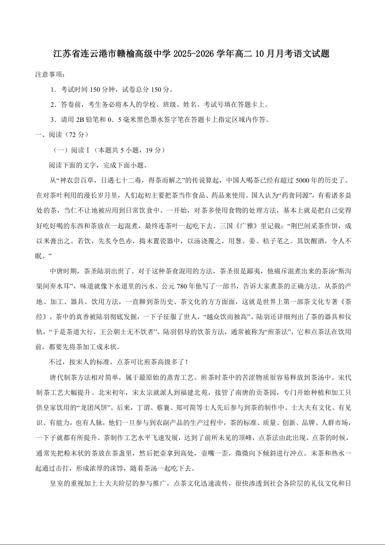高二语文+答案--江苏省连云港市赣榆高级中学2025-2026学年高二上学期10月学情检测