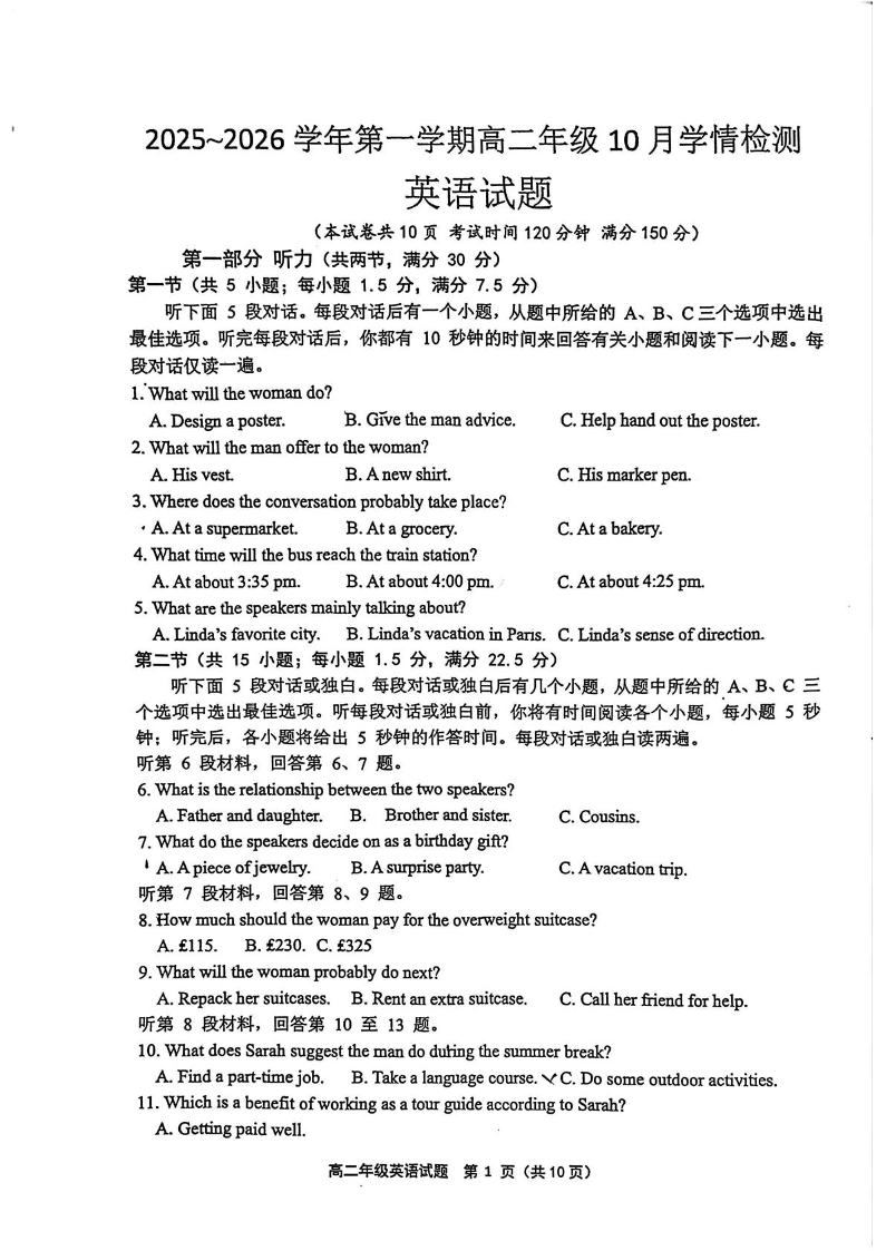 高二英语--江苏省连云港市赣榆高级中学2025-2026学年高二上学期10月学情检测