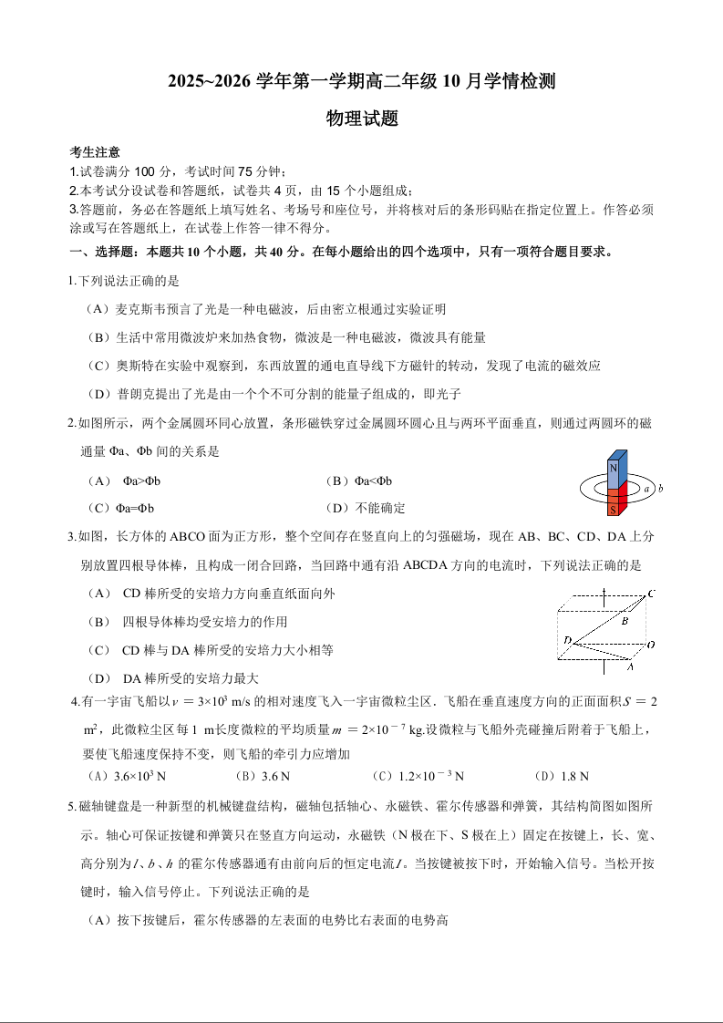 高二物理--江苏省连云港市赣榆高级中学2025-2026学年高二上学期10月学情检测