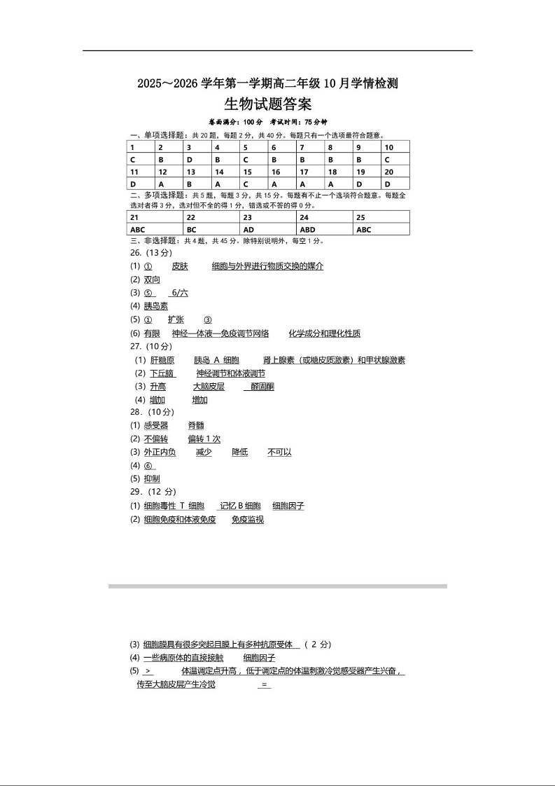高二生物答案--江苏省连云港市赣榆高级中学2025-2026学年高二上学期10月学情检测