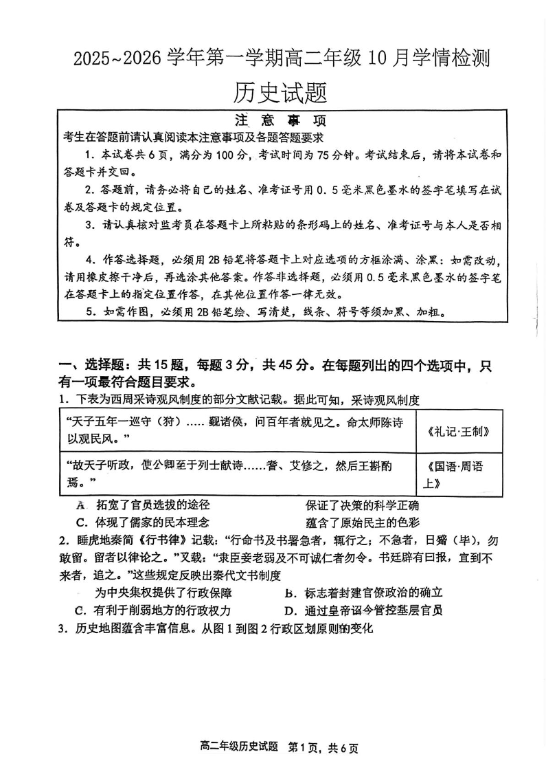 高二历史--江苏省连云港市赣榆高级中学2025-2026学年高二上学期10月学情检测